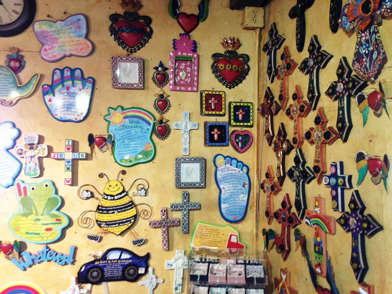 Der Innenhof der Anlage ist bepflanzt mit Pfefferbäumen (“Hihi, wir sind da wo der Pfeffer wächst”) und großen Blumen, die Kolibris anlocken. Ja genau – Kolibris! Doch nicht nur das ist exotisch, sondern auch die Devotionalien die es im Andenkenladen zu erstehen gibt. Hier stehen Heiligenbilder, neben Wasser aus Lourdes, neben Sorgenpüppchen, neben Bibleopoly, einer Version von Monopoly in der man statt ins Gefängnis zu gehen eine Runde “Meditieren” muss. Grell, bunt, viel zu teuer und ein allzu krasser Gegensatz zu der majestätischen Erscheinung der Mission.