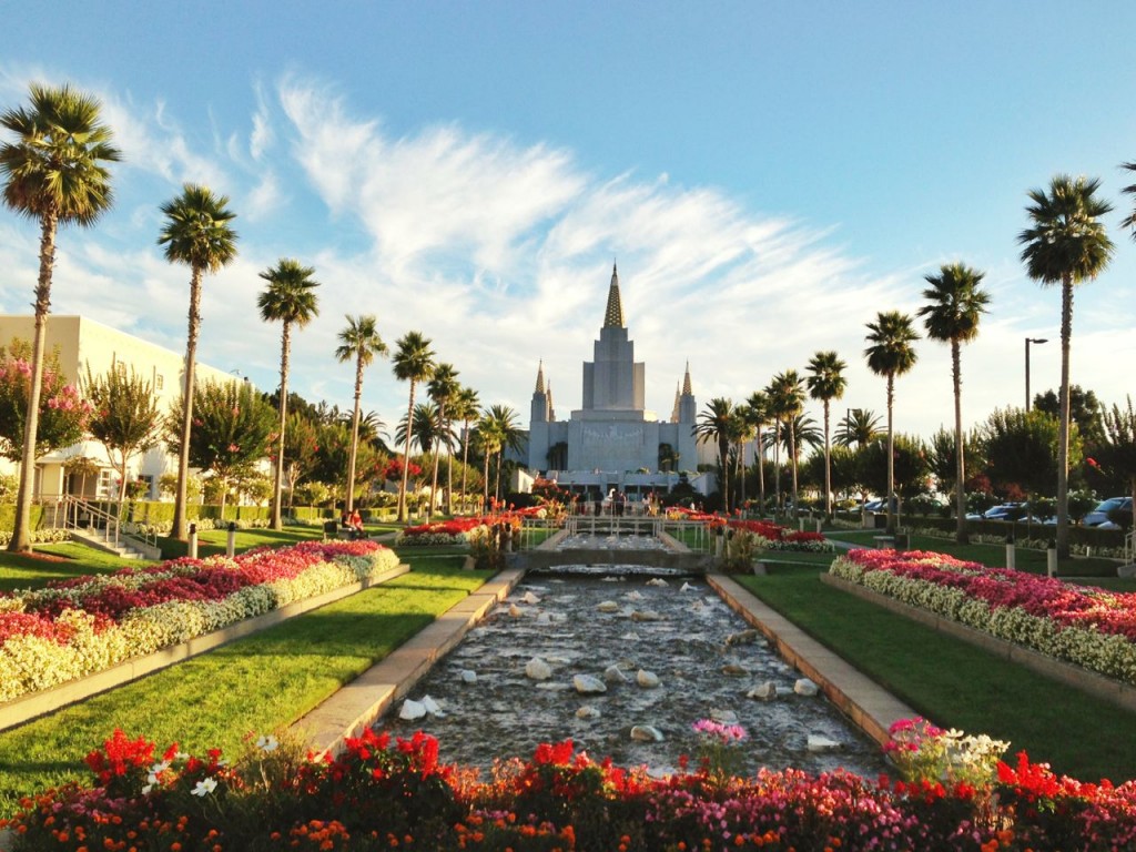 Nach dieser “Kurzen Einführung in den Glauben der Mormonen”, führen uns die beiden Frauen über das Gelände des Mormonentempels. Gerade geht die Sonne unter und so sehen wir einen atemberaubenden Sonnenuntergang über Oakland und San Francisco. Beeindruckende Kulisse für ein Haus Gottes!